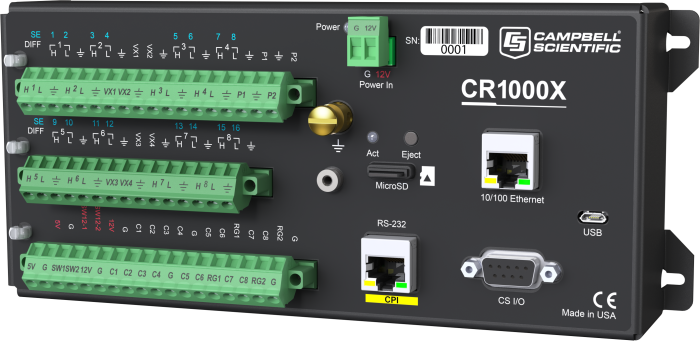 CR1000X是一款低功率的设备,用于传感器测量、直接/远程通讯连接、数据分析、外部设备控制、数据和程序的存储,采用密封装置屏蔽射频干扰,金属不锈钢外壳。精密时钟,支持Campbell Scientific 数据采集器通用的类BASIC编程语言—具备数据处理和分析功能。CR1000X 接线面板上有两个开关12V 端子,16 个模拟测量端子,端子可拆卸。